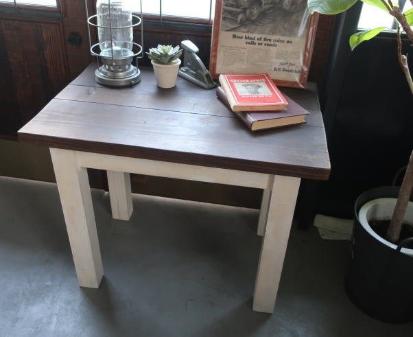 シャビー感のあるブラウン天板とホワイトの足元が